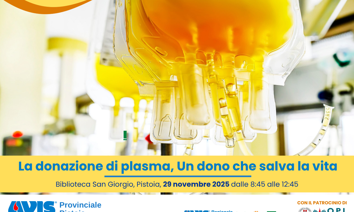 Avis Provinciale Pistoia organizza per sabato 29 novembre 2025, presso la Biblioteca San Giorgio di Pistoia, il convegno dal titolo “Donazione del plasma, un dono che salva la ...